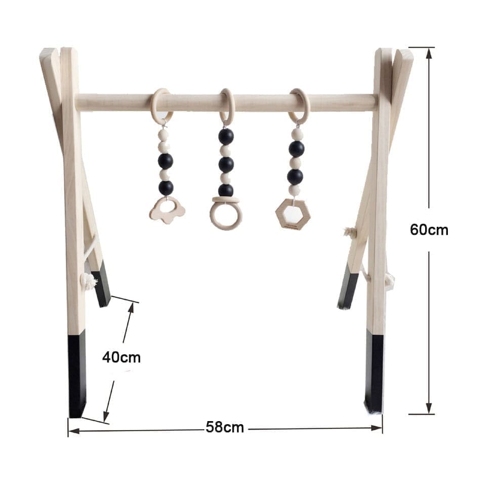 Gimnastyka dla bobasa z drewnianym stojakiem. Stojak zalecany dla dzieci od pierwszego miesiąca życia. Jest idealny do pierwszych zabaw maluszka. Dzięki dołączonym zawieszkom stojak zachęca do zabawy, przez co stymuluje zmysły oraz mięśnie już od pierwszych dni życia. Na produkt składa się stojak z zawieszkami, brak maty.
